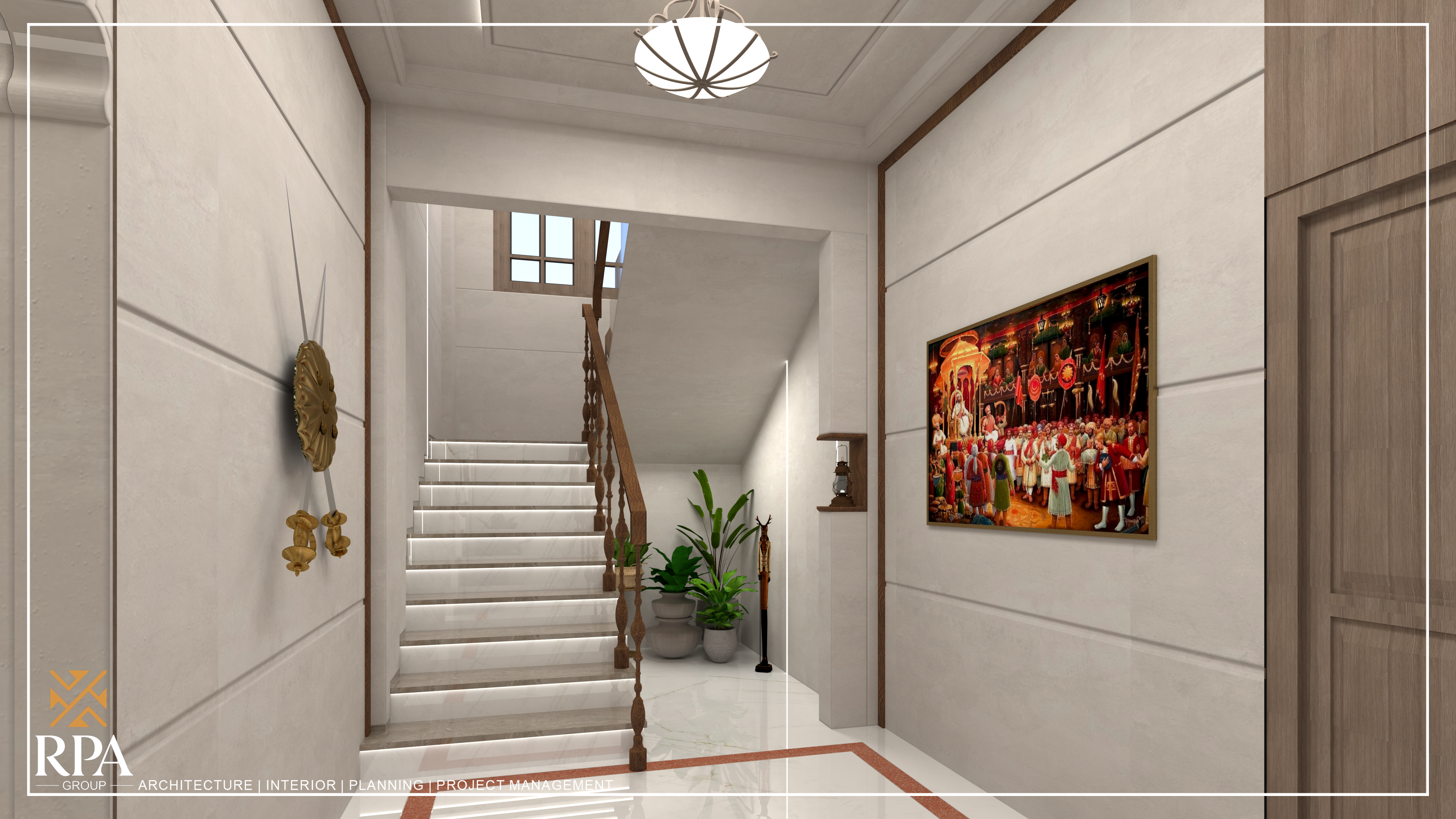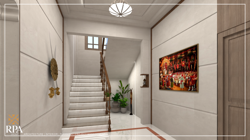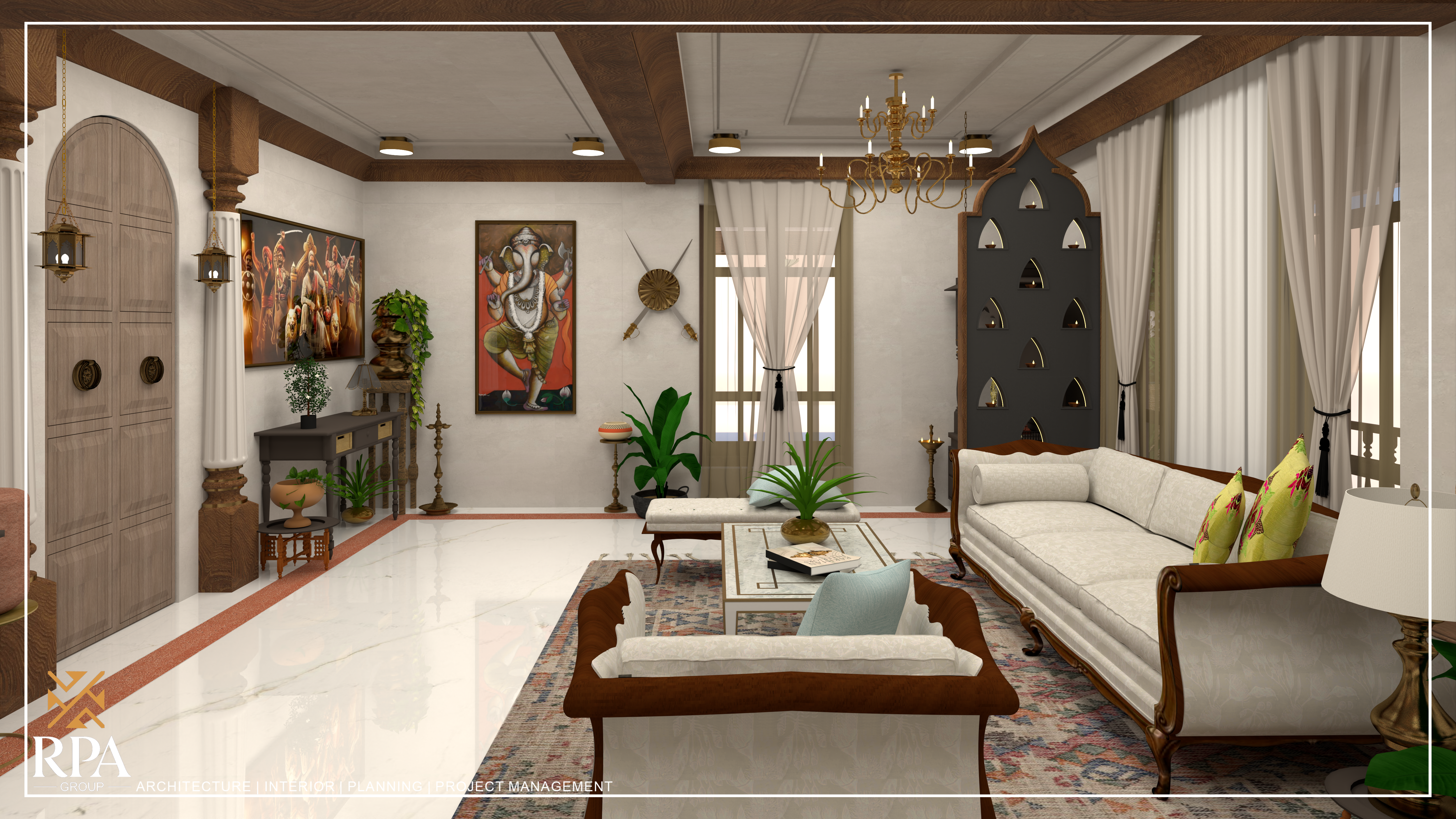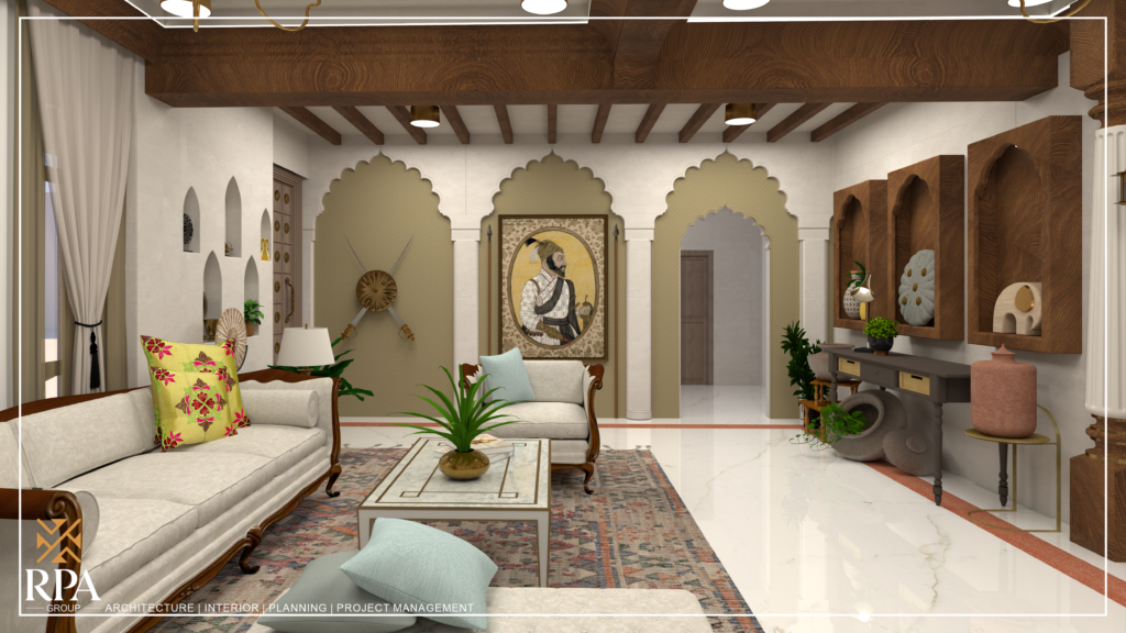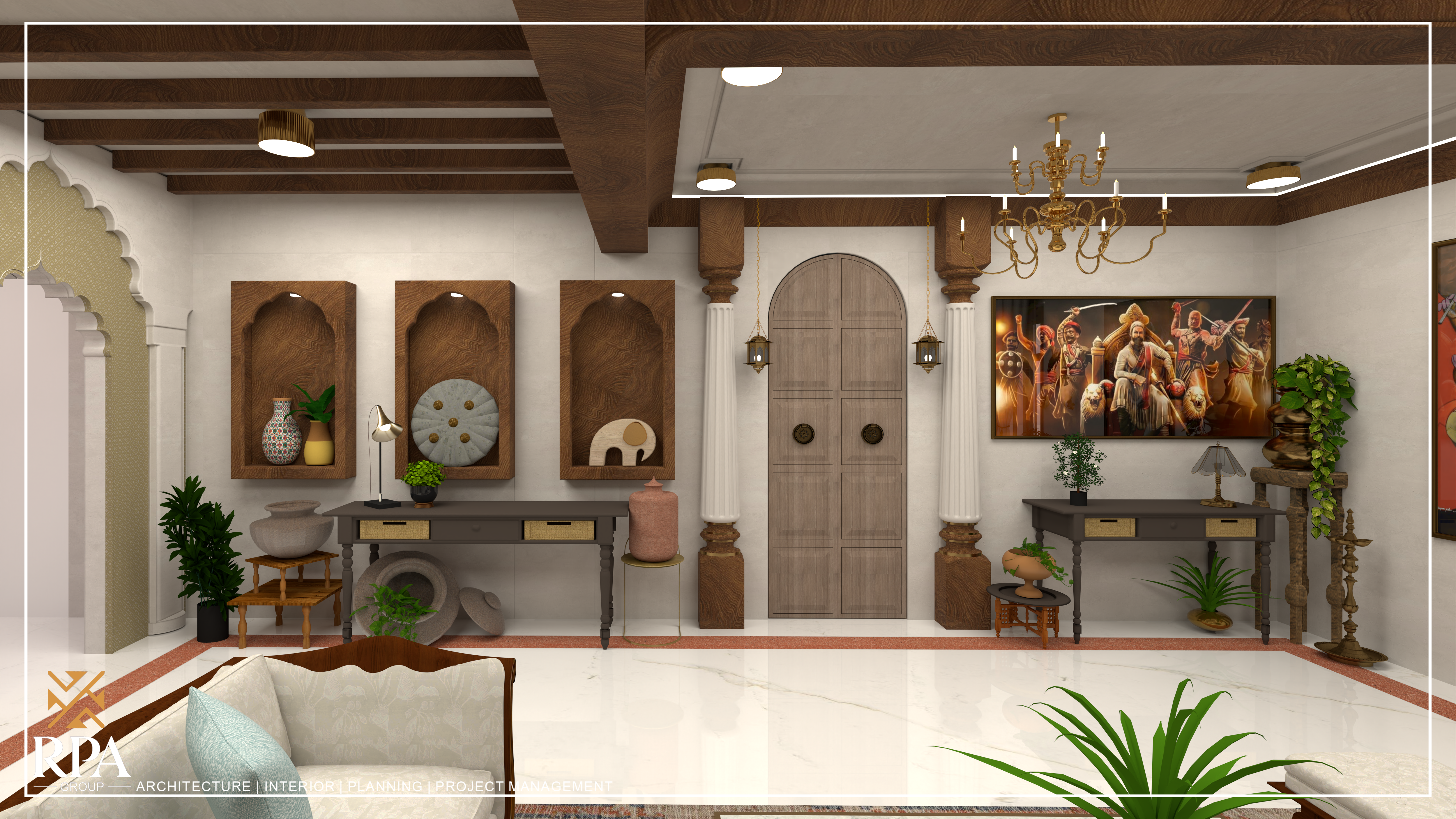 The Bhoir bungalow interior envisions a contemporary interpretation of the Shivaji Maharaj tribute and respect theme. It blends the grandeur of the Maratha era with modern aesthetics to create a space that is both reverent and inviting.